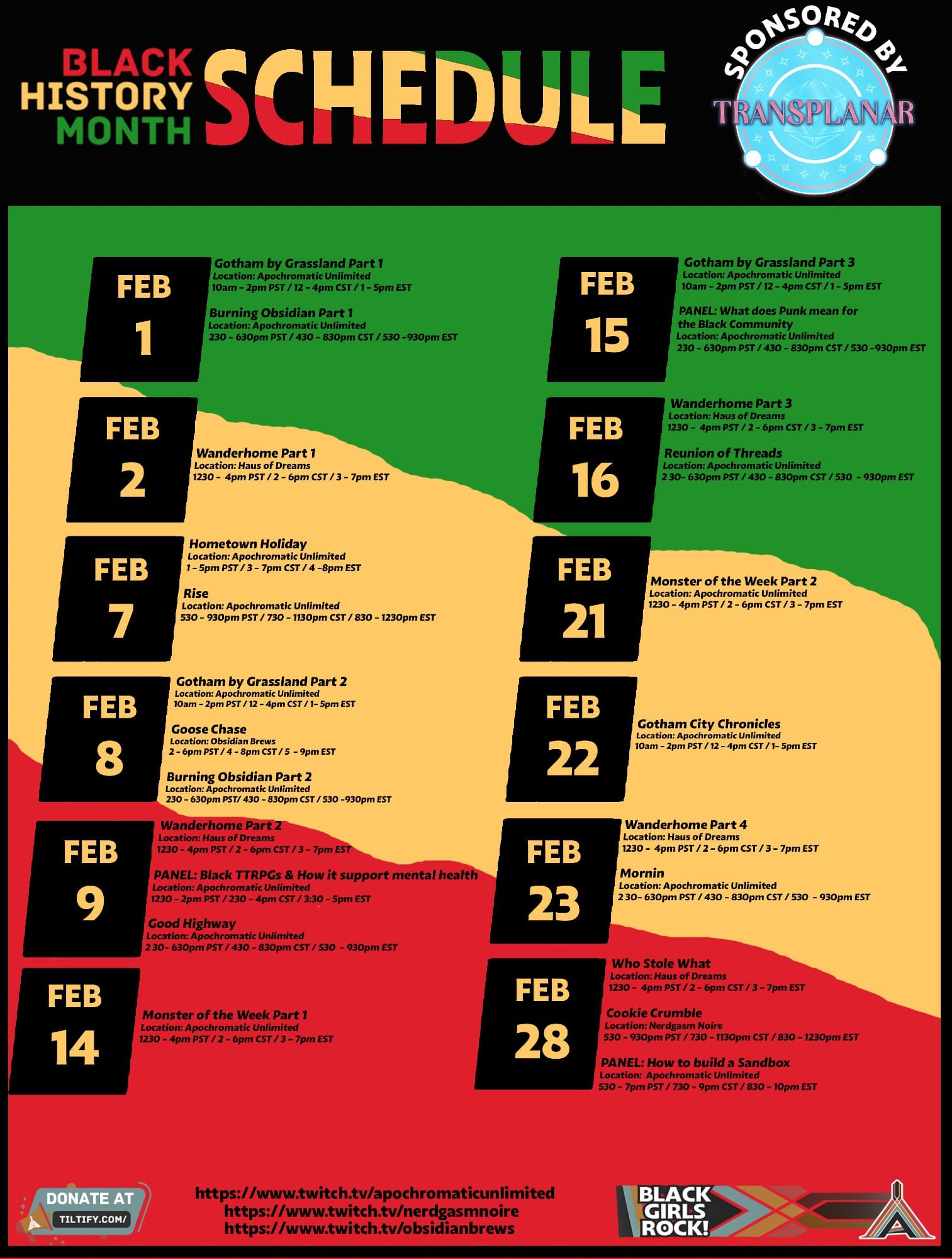 This month, I'm working on a charity stream for Black History Month. The folks over at Apocunlimited put it together to raise money for Black Girls Rock (you can donate too if you go to this link right here). It's been going great, not only am I going to be GMing a game on 2/28, but while things were getting set up I volunteered to be a producer for some of the other games (Goose Chase | Corner Shop).
